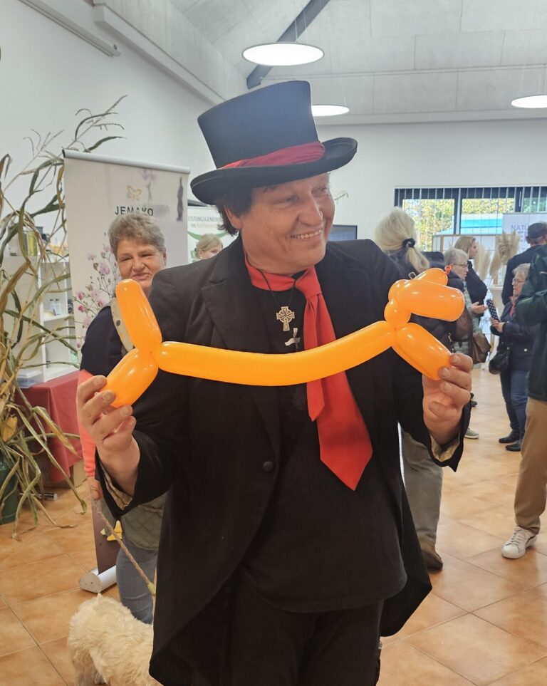 Aber nicht nur die Bücherei war auf dem Regionalmarkt vertreten – auch unser Jugendleiter Udo Mandelkow hat unseren Stand tatkräftig unterstützt und dafür gesorgt, dass der Besucherstrom nie abriss. Mit viel Charme und Witz formte er aus langen Luftballonschlangen Hunde, Pferde, Einhörner, Krokodile und sogar einen Adler 😮