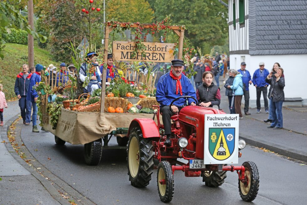 Pünktlich um 10.30 Uhr startete der festliche Ernteumzug mit geschmückten Erntewagen, Traktoren und Fußgruppen durch den Ortskern von Mehren hin zur Ev. Kirche. Viele Gemeindeglieder, von Jung bis Alt, nahmen an den Feierlichkeiten teil und begleitetet den Ernteumzug mit viel Applaus.